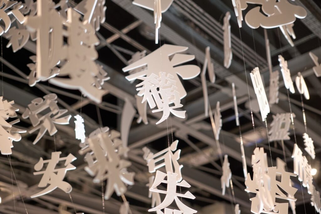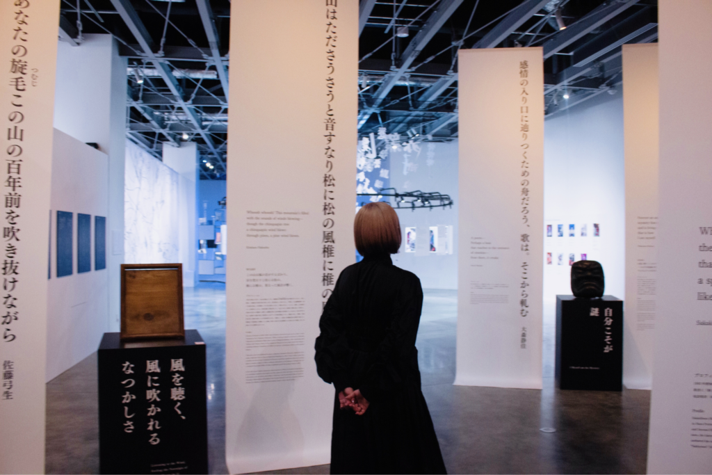 続くCHAPTER 2「時代を越える感情」では、天井から吊るされた雄大な短歌幕が印象的だ。古物の置かれた台座を中心に対になるように展示された2つの幕。右側が近代歌人の詠んだ歌、それに対して左側の幕で現代の歌人が返歌をするという試みで、時を経ても変わらない人間の「感情」を明らかにする。