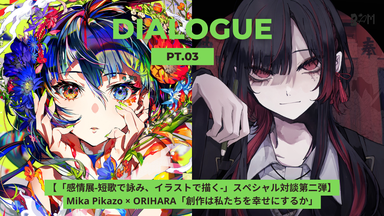 「短歌×イラスト」という異色な掛け算に加え、総勢50名もの作家が一堂に介した大規模展覧会。本展に合わせたBAMによるスペシャル対談シリーズ第二弾では、イラストレーター・イメージディレクターとして活躍するORIHARAと、Mika Pikazoによる対談の前後編をお届けする。