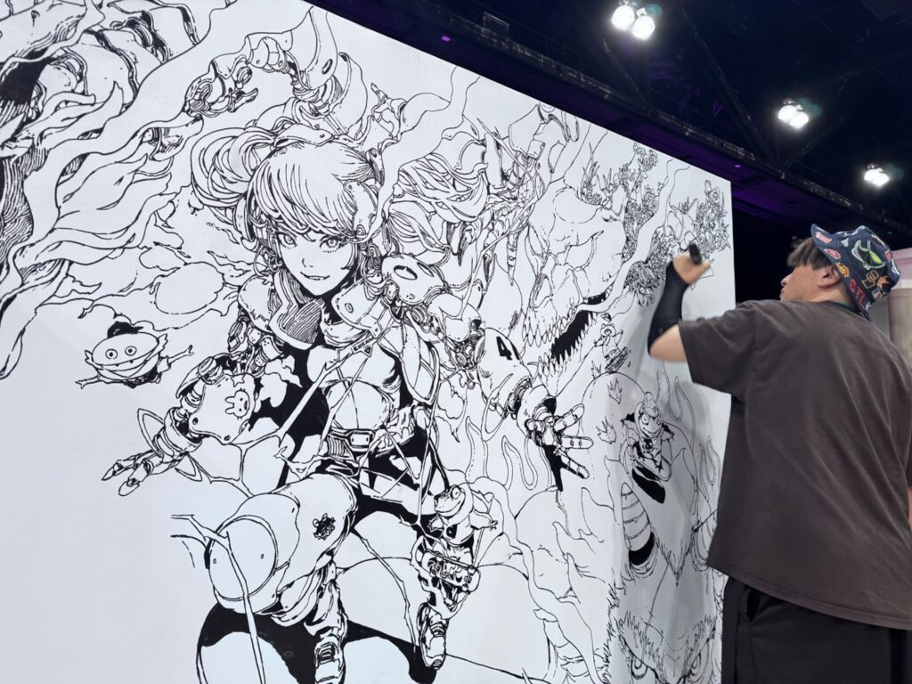 Acky Bright – 当時はSNSをほとんど活用していなかったので、XやInstagramにイラストを毎日投稿することから始めました。寺田克也さんやキムジョンさんらの影響もあり、イベントに出てライブドローイングをしていました。2021年には、憧れだった寺田克也さんと一緒にライブドローイングをさせて頂きましたが、あれ以上に緊張するシチュエーションはないので、どんな国や規模のイベントでも緊張しなくなりました。