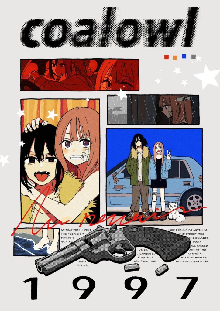 coalowl – この絵自体が架空の『1997』という映画のポスターです。私が90年代の映画が好きで、ロードムービーとか、逃亡劇とか、なんか「こういうのいいよね」っていう要素をかき集めて作りました。90年代ってなんか切ない、終末感とかもあって。