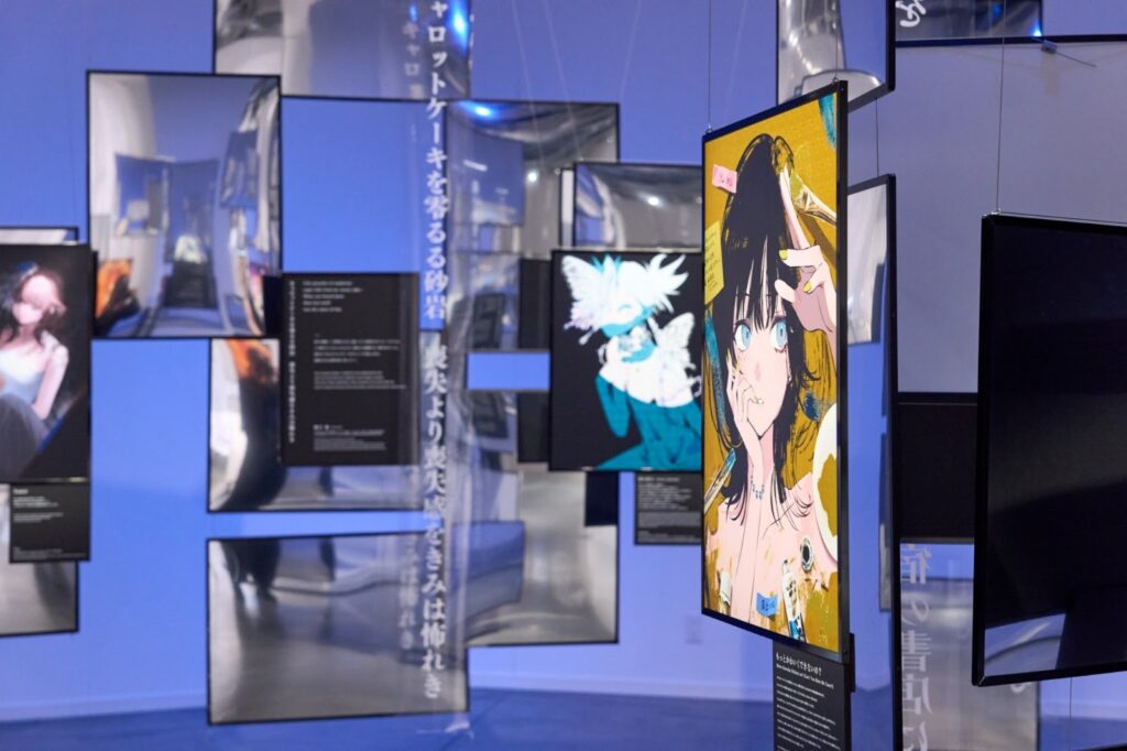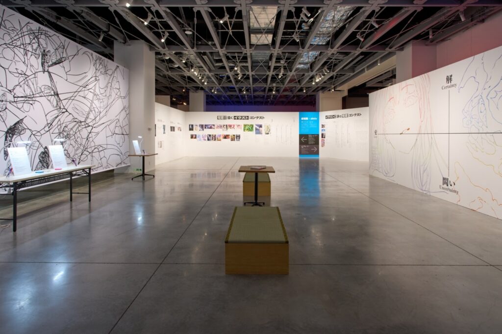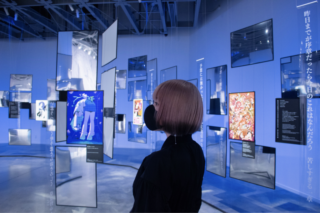 続く最後の区画、CHAPTER 5「感情の表現」では、展示を通して抱いた感情を振り返りつつ、鑑賞者がそれぞれの想いを表現するエリアとなっている。展示に合わせて開催されていたpixivとの協同開催のコンテストで選ばれた数々の短歌(図録掲載されていないものも含まれるので必見)や、安倍𠮷俊のアイデア段階のラフから完成に至るまでの原画、更にはMika Pikazoによるメイキング映像など、会場でしか味わえない企画が用意されている。