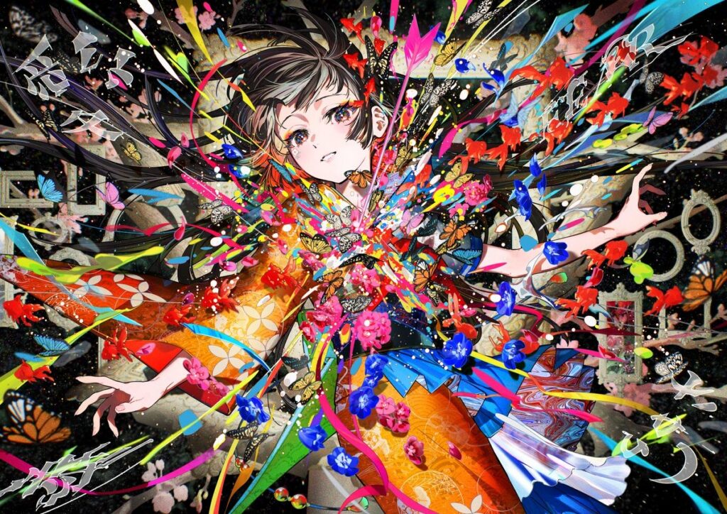 女の子自身の表情はあまり強い表情ではなく、なんとも言葉にできないような揺らぎのある表現を意識し、中心に広がる色はすごく激しくエネルギッシュにしています。